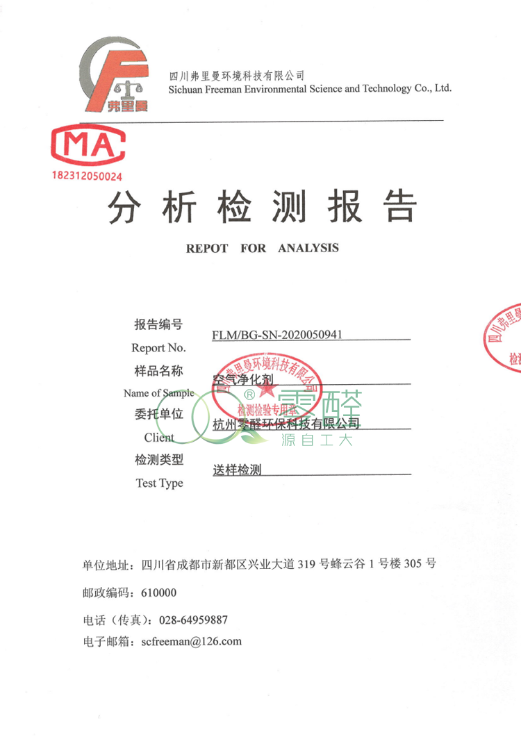 檢測報告:甲醛去除率