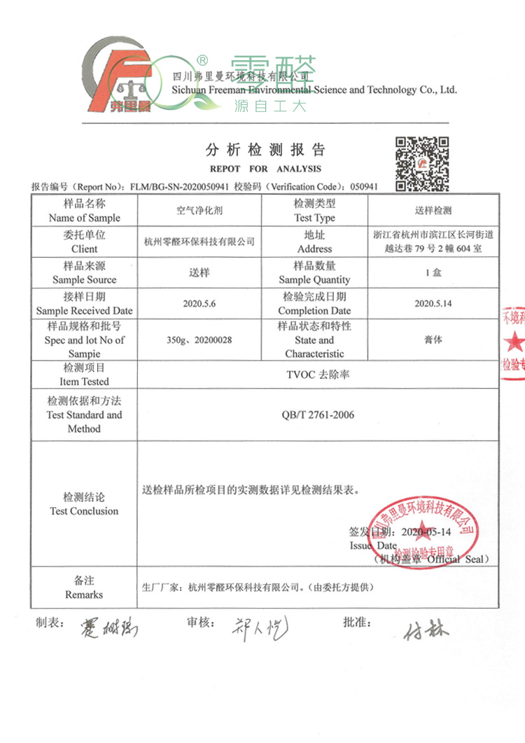 檢測報告:TVOC去除率