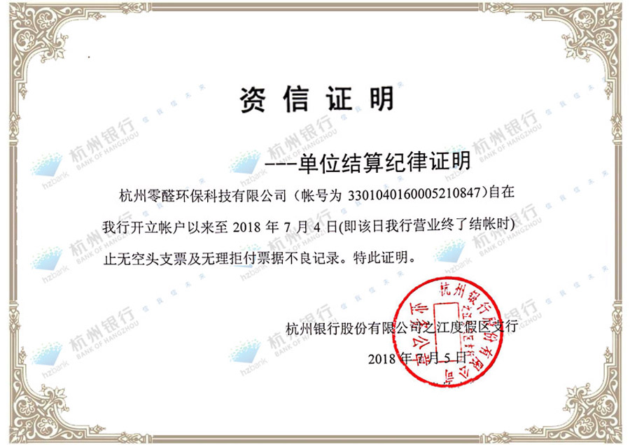 由開戶行杭州銀行開具的資信證明,我司自成立以來,在開戶行無不良記錄,信用良好。