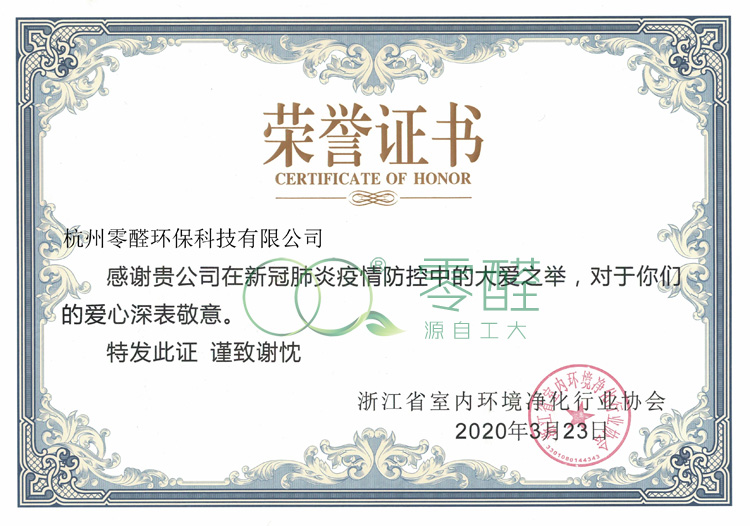 2020年3月26日,浙江省室內(nèi)環(huán)境凈化行業(yè)協(xié)會(huì)為杭州零醛環(huán)??萍加邢薰巨k法了榮譽(yù)證書,嘉獎(jiǎng)我公司的愛心之舉。